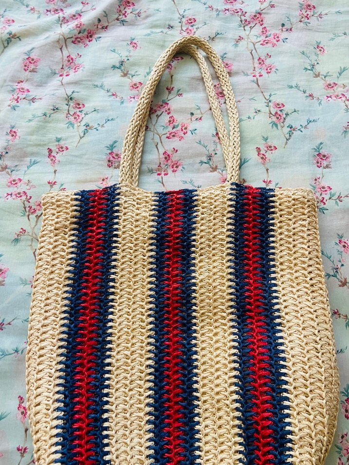Çizgili desenli, hafif renklerde örgü bohem kadın çantası, yumuşak örgü kumaştan üretilmiştir, günlük kullanım için uygundur.