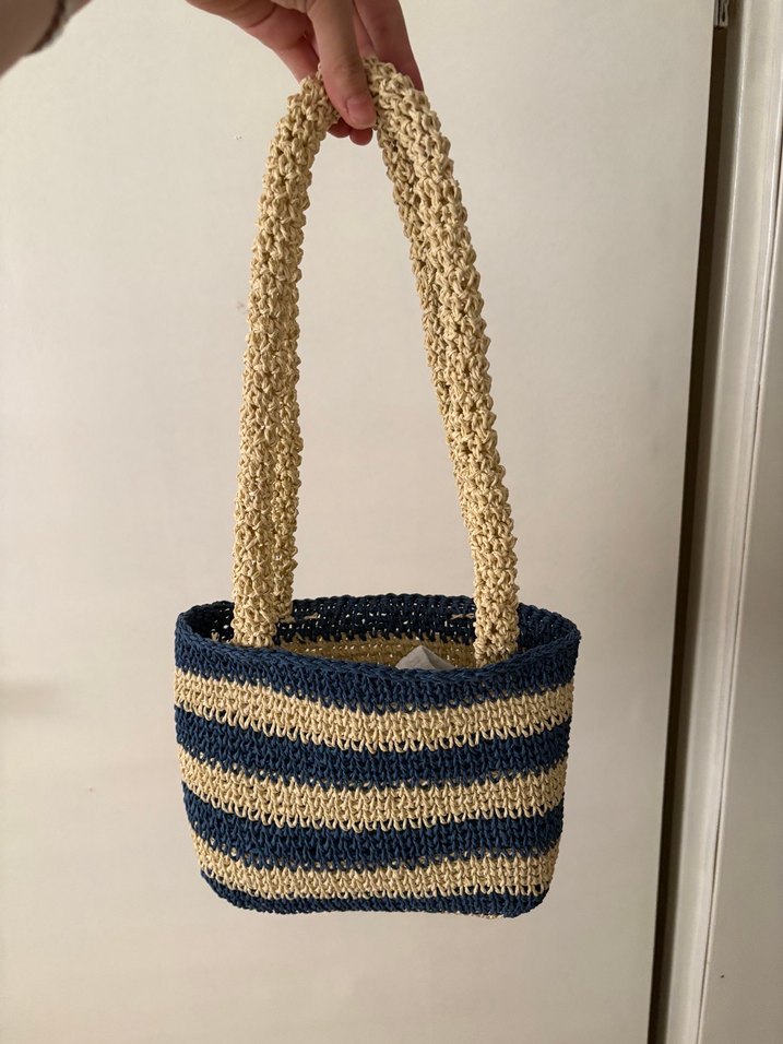 Hafif mavi ve bej çizgili örgü kadın çantası, günlük kullanıma uygun bohem tarz sunar. Yumuşak örgü kumaşıyla rahat ve retro bir görünüm sağlar.