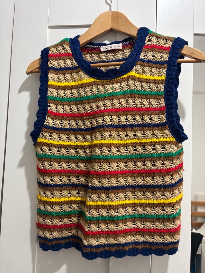 Renkli çizgili, bohem tarzda, yuvarlak yaka ve kolsuz, bol kesim örgü kadın süveter. Günlük kullanıma uygundur. Hiç kullanılmamıştır