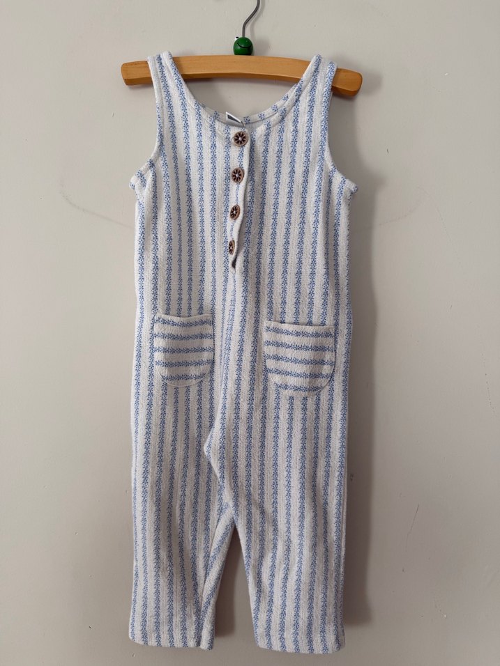 çizgili, düğmeli ve cepli, kolsuz tulum. Severek kullandık küçük geldiği için satıyorum.