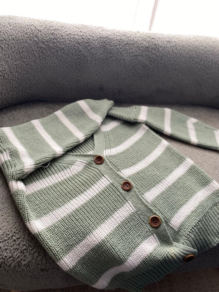 beyaz çizgili, uzun kollu, örgü kumaştan hırka. Önden düğmeli ve sokak stiline uygun.