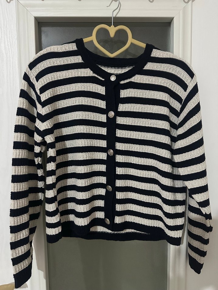 Uzun kollu, yuvarlak yaka ve bol kesime sahip örgü kadın hırka. Gri ve beyaz çizgili, midi uzunlukta, günlük kullanıma uygun.