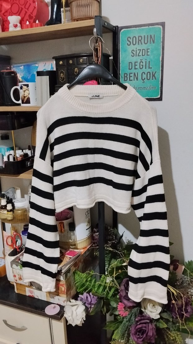Uzun kollu, bol kesim beyaz örgü kazak, siyah çizgili. Bisiklet yaka ve normal boyda, rahat ve sokak stili için uygun ön kısmında leke, mevcut