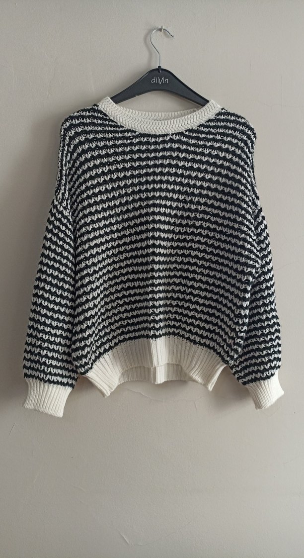 Bu kadın kazak, örgü dokusu, uzun kollu ve yuvarlak yaka özelliklerine sahiptir. Beyaz ve gri çizgili deseniyle rahat ve salaş bir kesime sahiptir. Günlük kullanım için uygundur. Üzerinde 'diyir' etiketi bulunur.