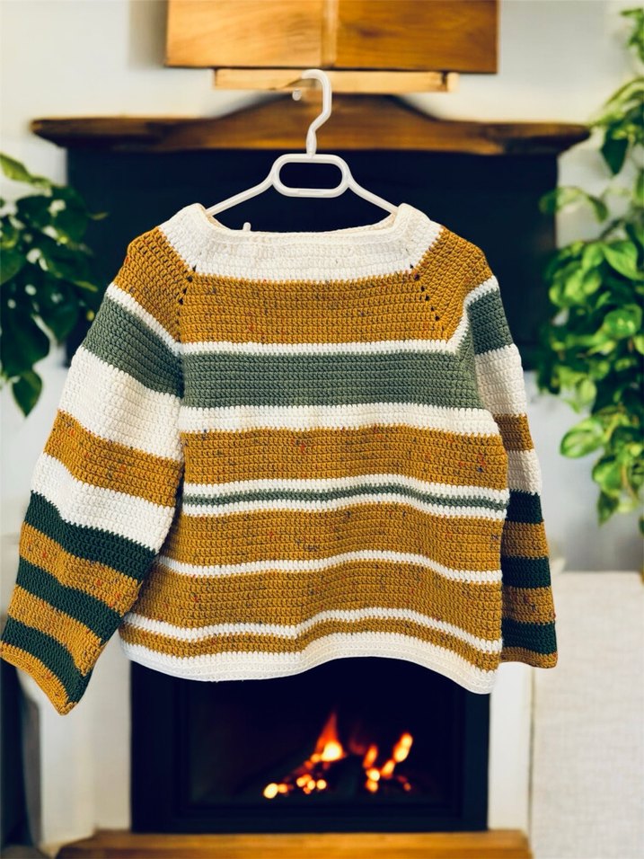 Bu kadın kazak, bol kesim, uzun kollu ve bisiklet yaka tasarıma sahiptir. Yeşil, beyaz ve hardal rengi tonlarında çok renkli çizgilerle örülmüş, rahat ve gündelik bir sokak stili sunar. Günlük kullanım için uygundur. Tamamıyla el emeğidir. Üşümek istemeyenler bu yumuşacık kazağı kaçırmasın.