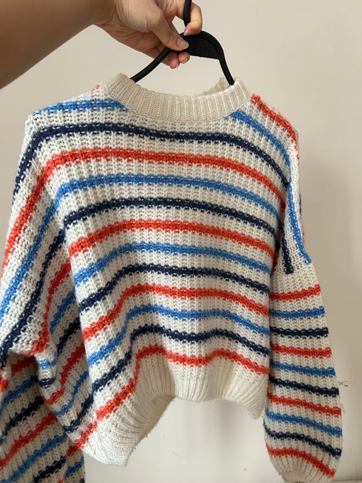 Uzun kollu, yuvarlak yaka ve bol kesim kadın kazak. Hafif renkli çizgili örgü kumaştan, rahat ve günlük sokak tarzı için uygundur.