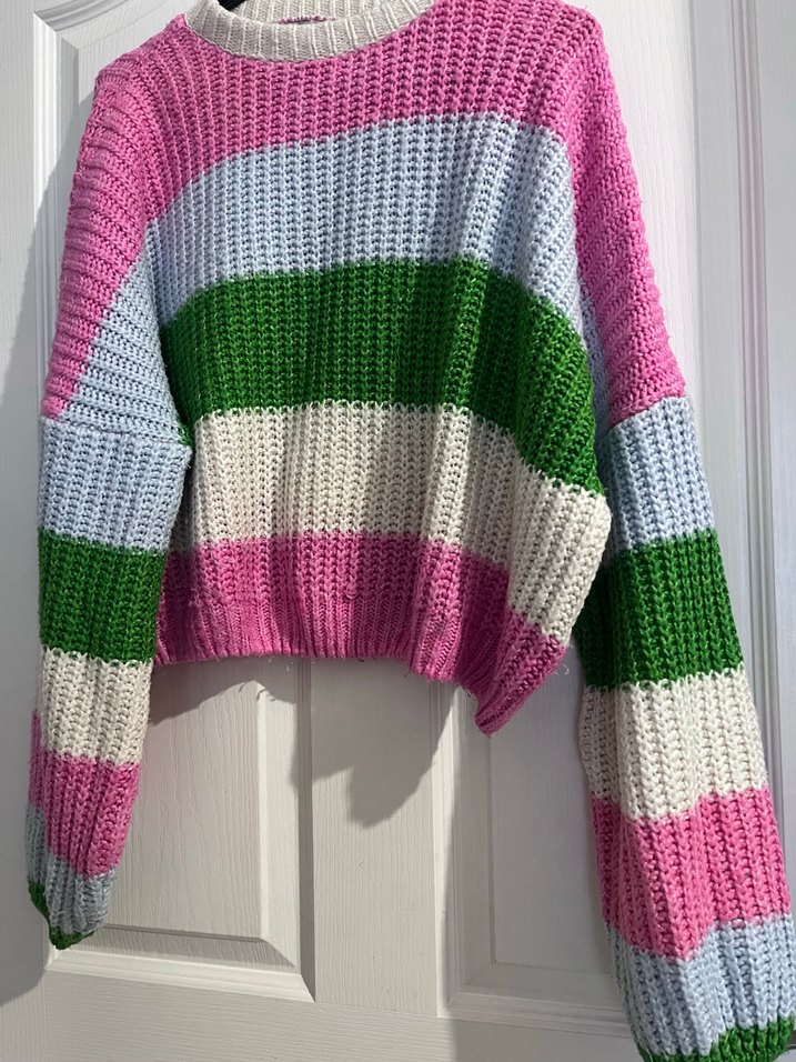 Uzun kollu, yuvarlak yakalı ve bol kesim kadın kazak. Pastel tonlarda pembe, mavi, yeşil ve krem renkli çizgili örgü kumaştan yapılmıştır, rahat ve bohem tarz sunar.