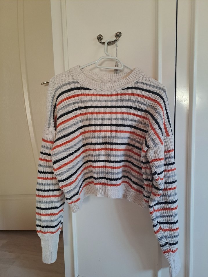 Uzun kollu, yuvarlak yakalı kadın örgü kazak. Beyaz zemin üzerinde gri, siyah ve turuncu çizgili, rahat kesim ve midi boyda. Günlük sokak stili için uygundur.