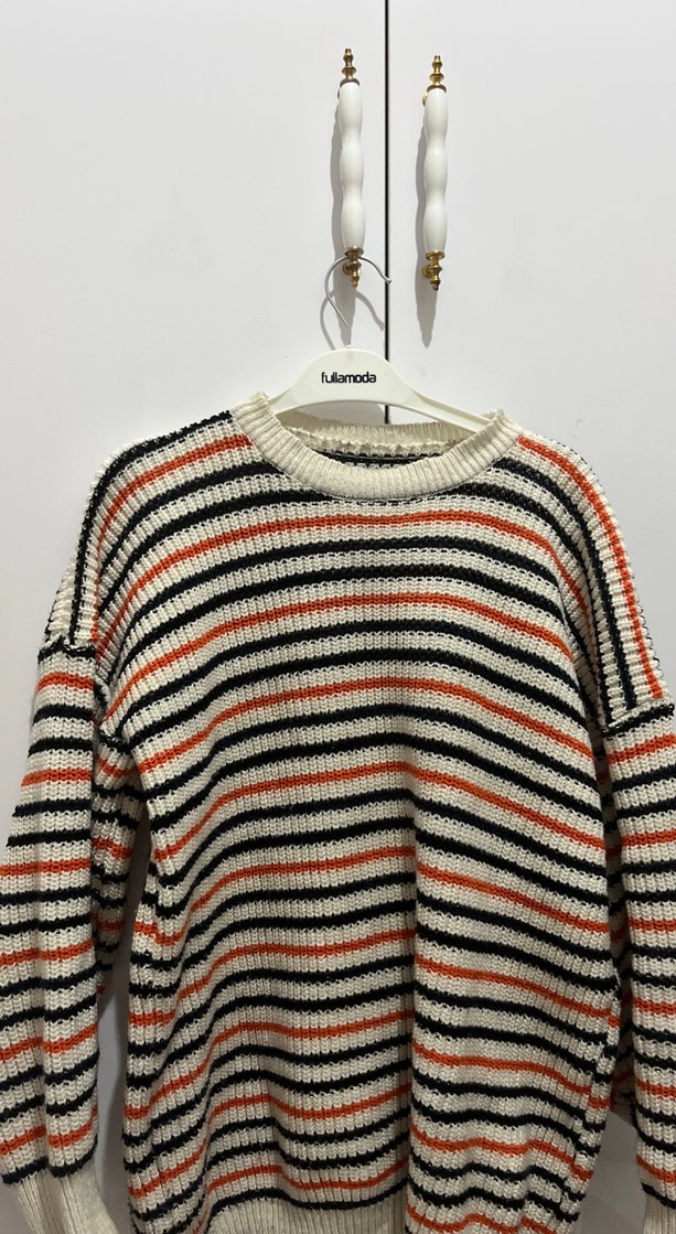 Çok renkli çizgili desende, uzun kollu, yuvarlak yaka, bol kesim örgü kadın kazak.
