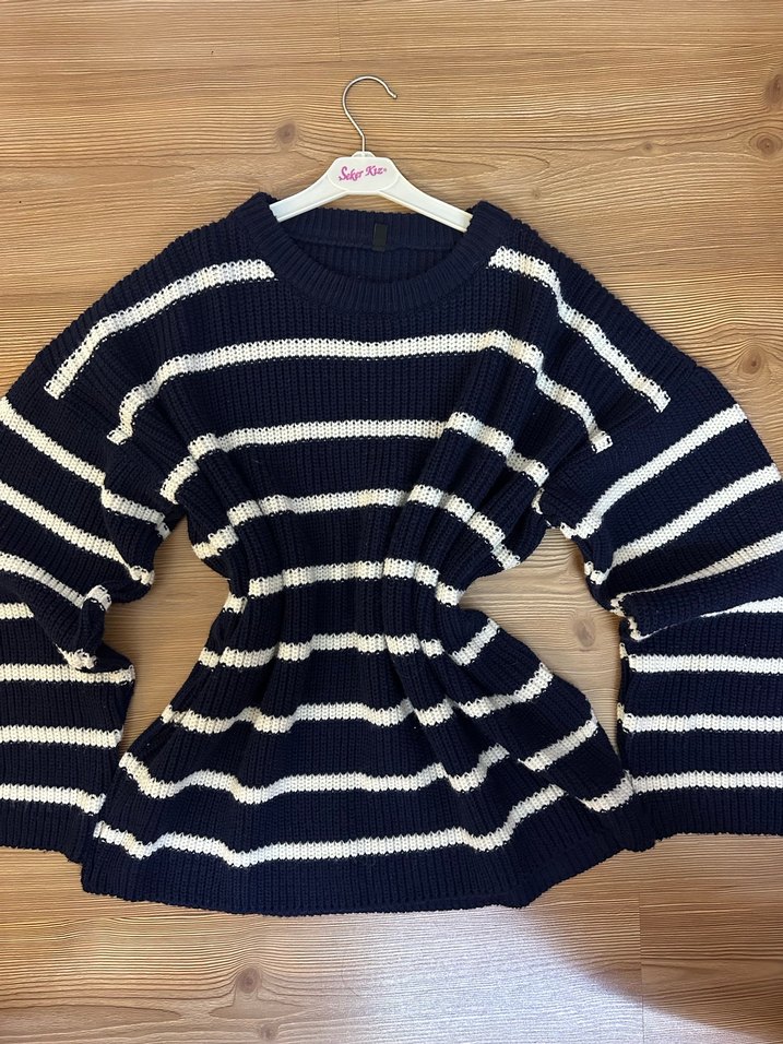 Örgü kumaştan yapılmış, uzun kollu ve yuvarlak yakalı bu kazak, bol kesimi ve kısa uzunluğuyla rahat bir kullanım sunar. Mavi ve beyaz çizgili deseniyle günlük sokak stiline uygundur.