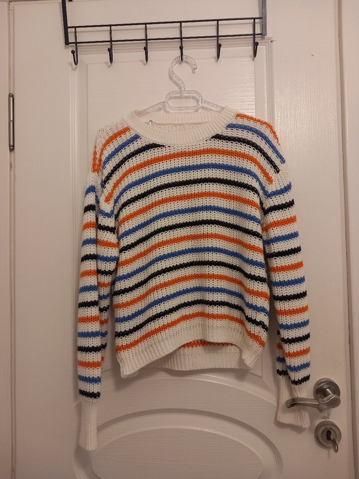 Örgü kadın kazak, uzun kollu ve yuvarlak yaka detayına sahiptir. Hafif çok renkli çizgili deseni ve bol kesimiyle günlük sokak stili için uygundur.