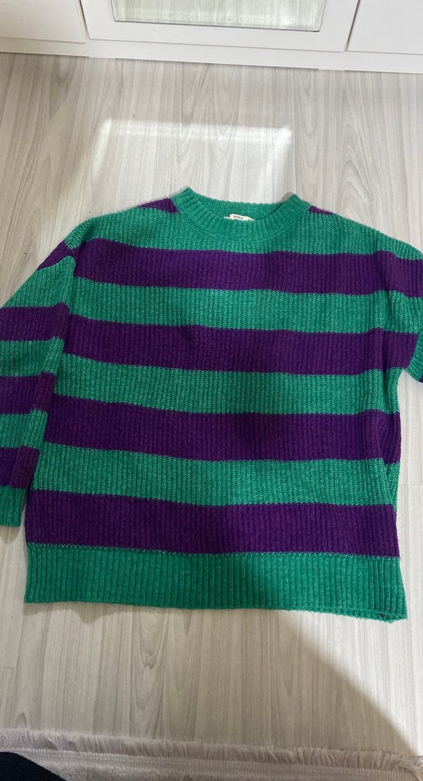 Örgü, yuvarlak yaka ve uzun kollu kadın kazak. Koyu yeşil ve mor çizgili, bol kesim ve rahat sokak stili sunar.