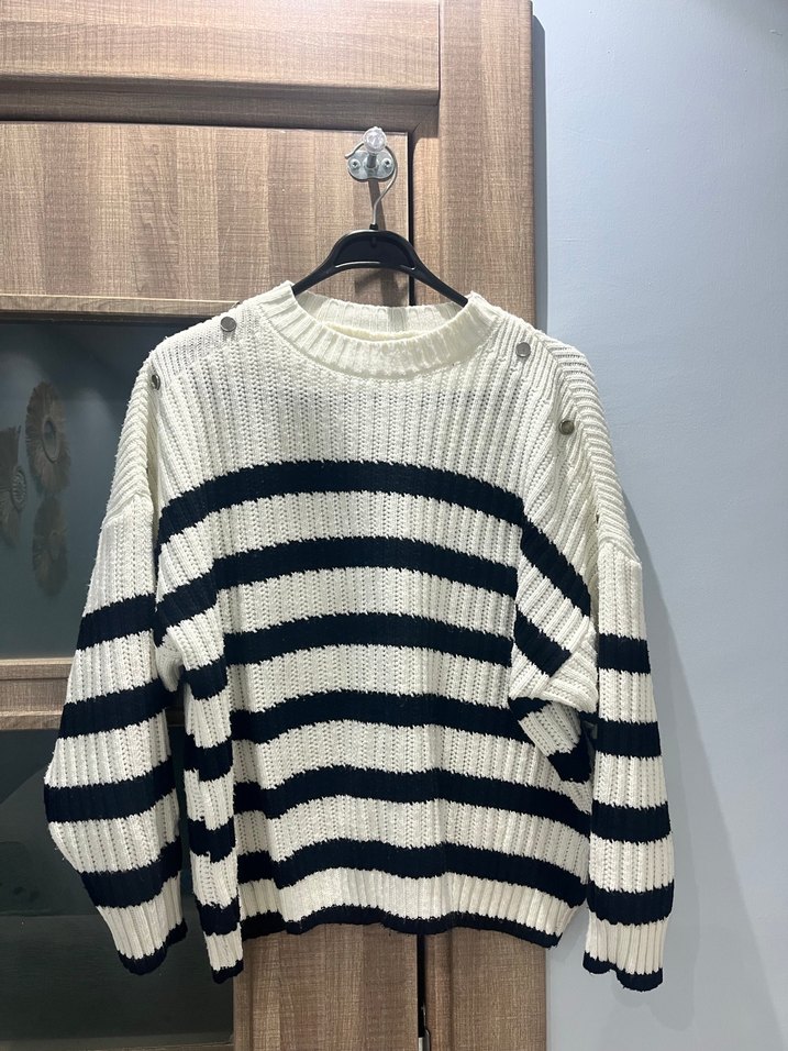 Uzun kollu, yuvarlak yakalı örgü kadın kazak. Beyaz ve gri çizgili, rahat kesimli, günlük kullanıma uygun.
