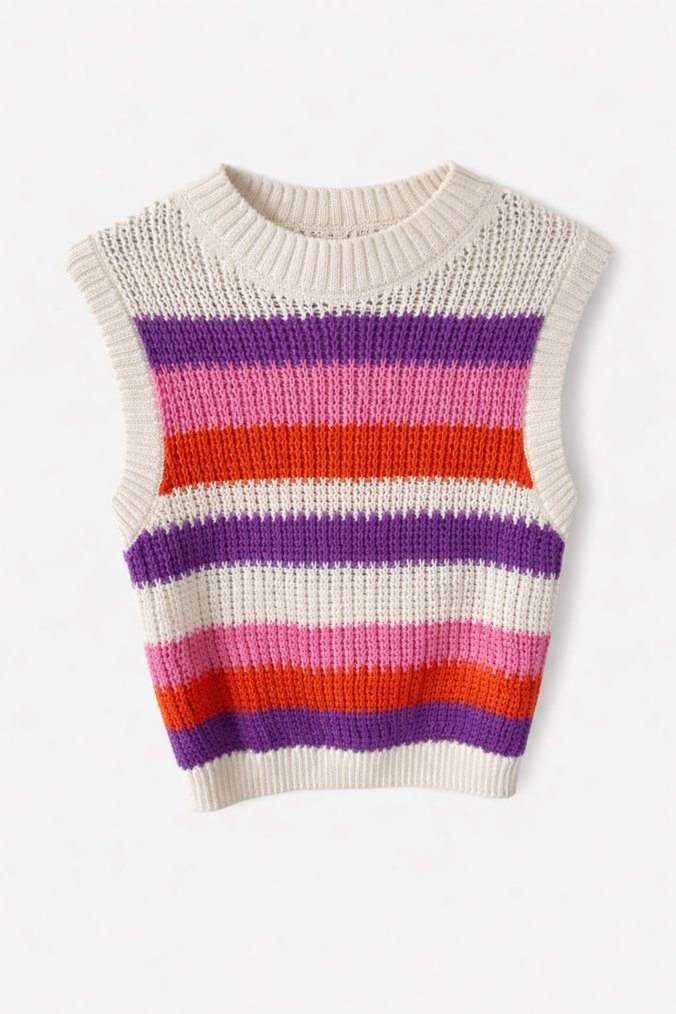 Bu kolsuz süveter, pastel renkli çizgili desenler ve yuvarlak yaka ile örgü, dar kesim tasarım sunar; rahat ve çağdaş bohem tarzda.