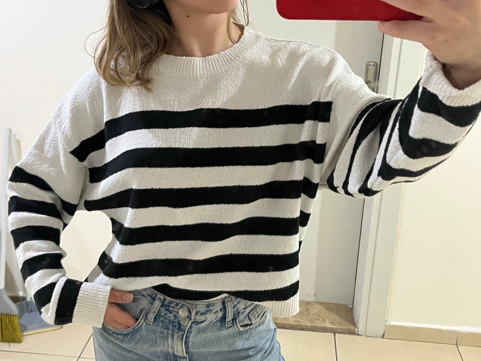 Yuvarlak yakalı, uzun kollu ve bol kesimli kadın triko kazak. Yumuşak pamuktan, beyaz ve gri çizgili desene sahip, günlük kullanım için uygundur.