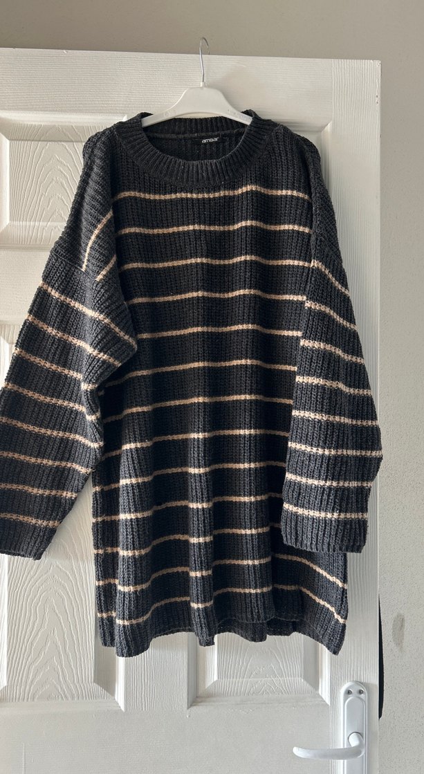 Bu kadın kazak, çizgili desenli örgü yün kumaştan yapılmıştır. Uzun kollu, yuvarlak yakalı ve bol kesimdir. Gri ve kahverengi tonlarda, günlük kullanıma uygundur.