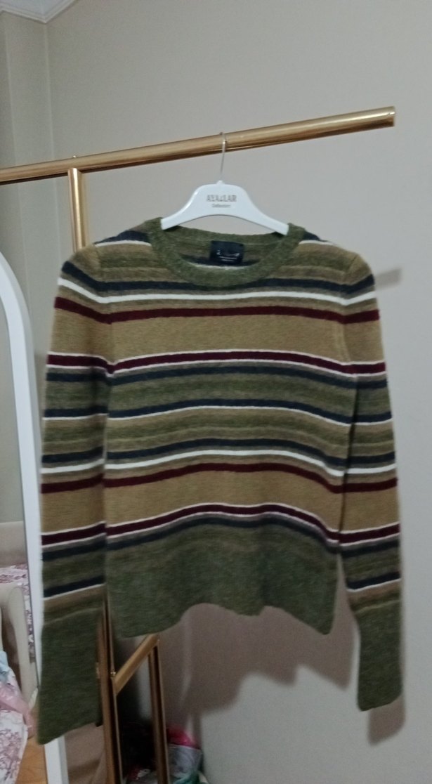 Bu kadın yün kazağı, yuvarlak yaka ve uzun kolludur. Rahat kesimli, örgü dokulu ve çok renkli çizgili desene sahiptir. Günlük sokak stiline uygundur.