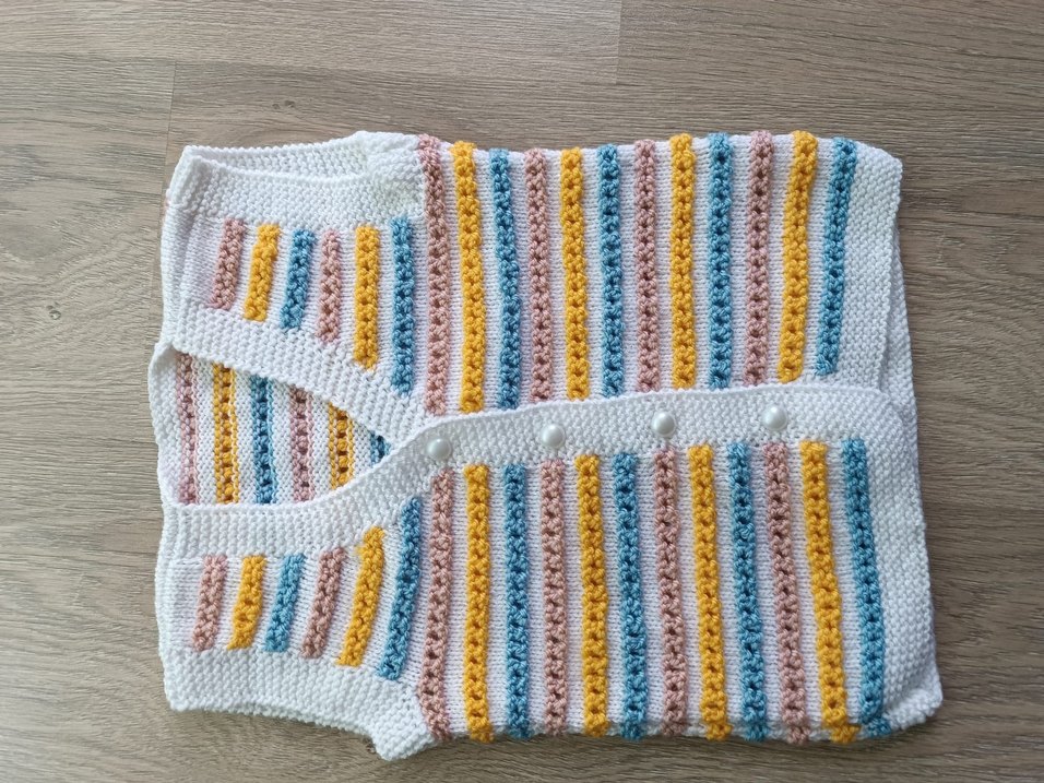 Bohem tarzda, pastel renklerde çizgili örgü kız hırkası. Askılı kolları ve inci düğme detayları bulunur.