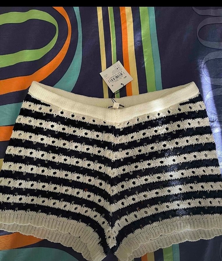Koyu renkli çizgili, örgü mini şortlar rahat kesimi ve bohem tarzıyla dikkat çekiyor. Dış mekan kullanımı için uygun, konforlu ve retro bir görünüm sunar.