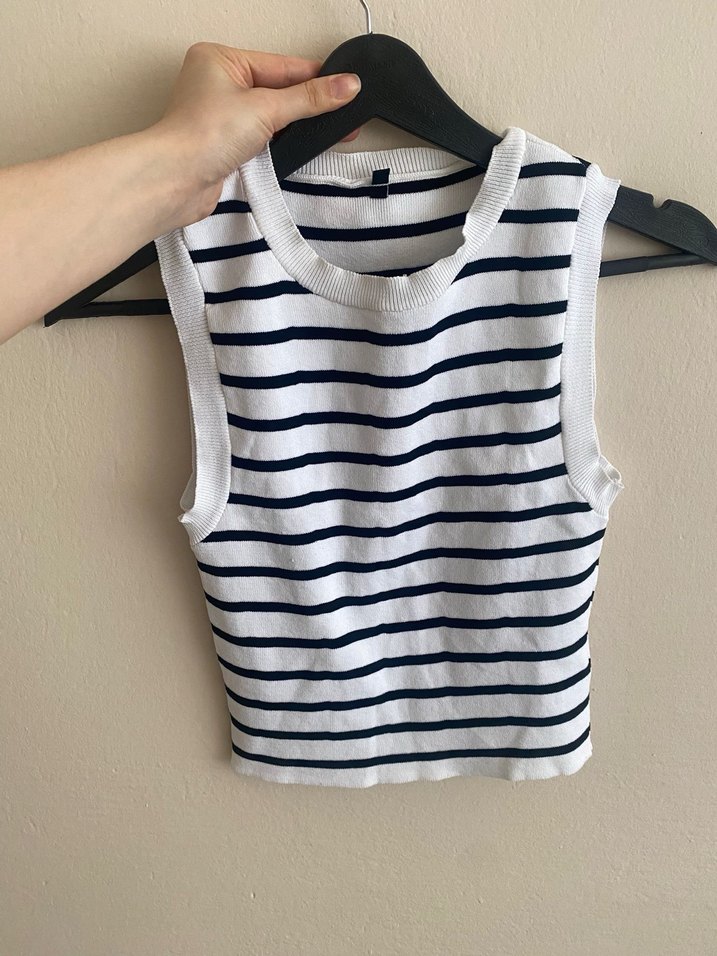 Yüksek yakalı, çizgili ve örgü pamuklu kumaştan yapılmış, vücuda oturan kolsuz kadın atlet. Günlük sokak stili için uygundur.