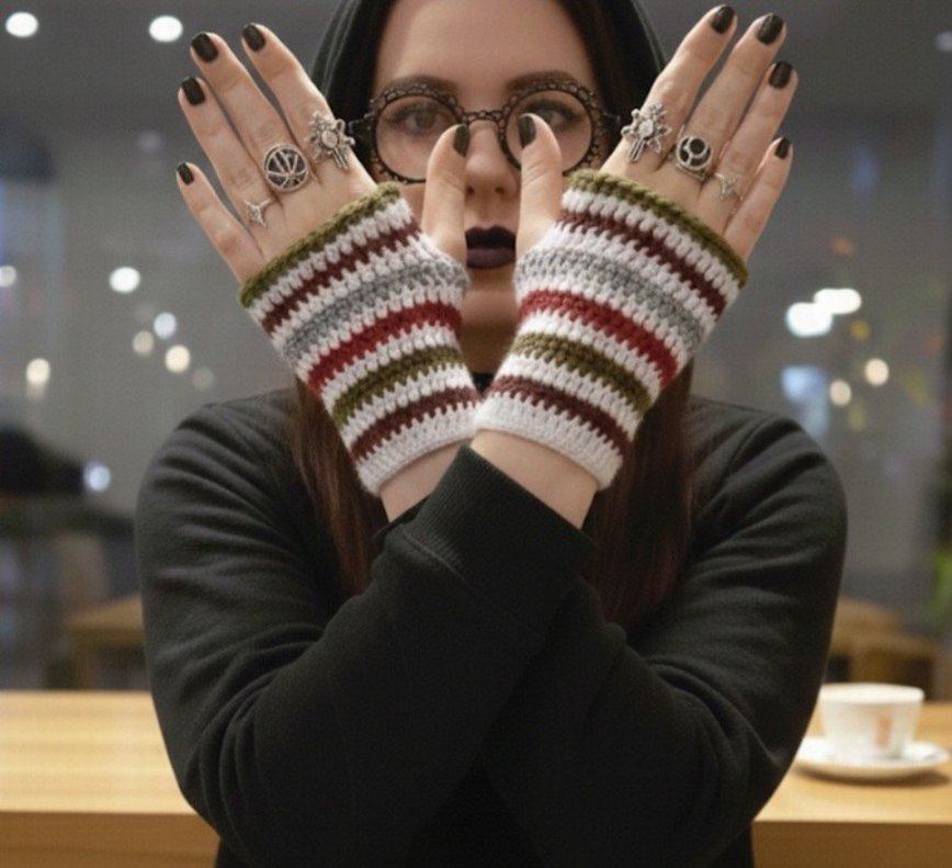 GÖRSEL VE TASARIMI BANA AİTTİR ✔️✔️ KARGOYA HAZIR ÜRÜN DİREK SATIN ALABİLİRSİNİZ ✨️ Gri, beyaz, yeşil ve kırmızı çizgili örgü parmaksız kadın eldivenleri. Bohem ve retro tarzı yansıtan rahat bir görünüm sunar.