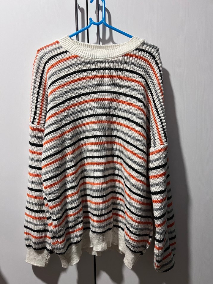 Çizgili desenli, uzun kollu, oversize kesim kadın triko kazak. Gri ve çok renkli, günlük kullanıma uygun rahat bir sokak stili kazak.