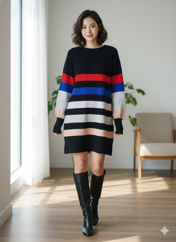 Uzun kollu, yuvarlak yakalı, bol kesim triko elbise. Koyu renkli çok renkli çizgilerle rahat ve sokak stilinde tasarlanmıştır. Günlük kullanıma uygundur. Cebi yoktur tüylenme mevcuttur