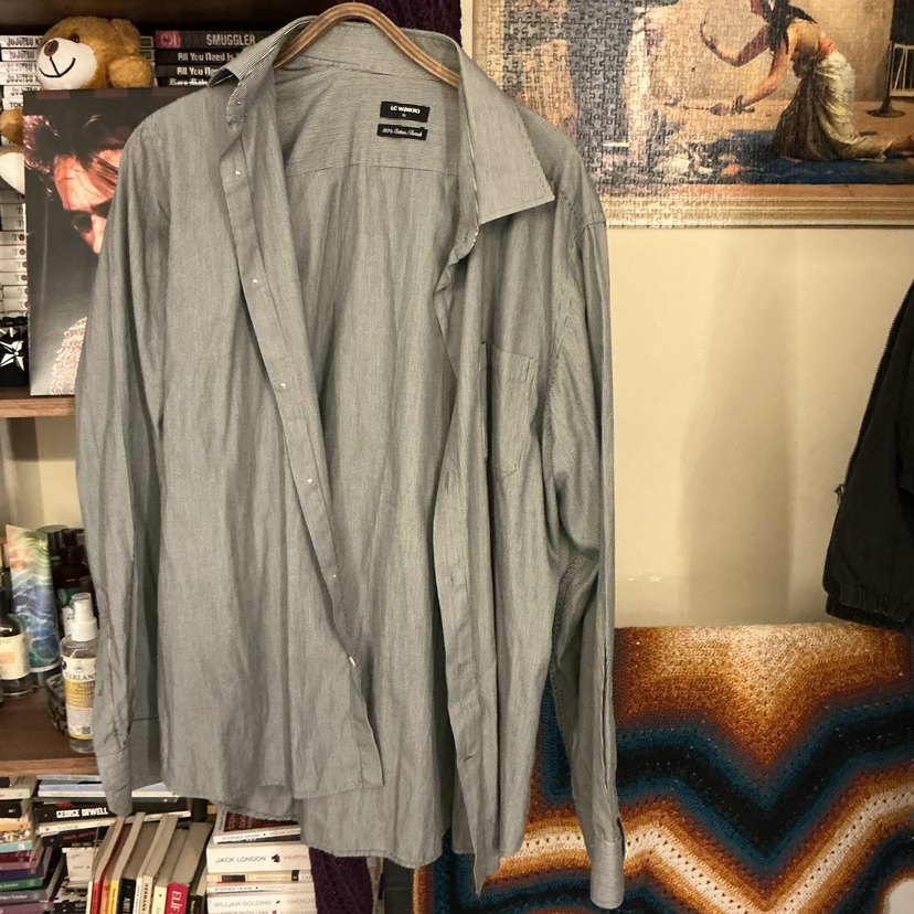 Çizgili pamuk erkek gömlek, rahat kesim ve uzun kollu. Düğmeli ön kısmı ve notlu yaka detayıyla sade ve kullanışlıdır. Ofis veya günlük kullanım için uygundur.