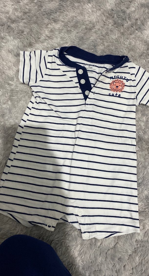 Kısa kollu, düğmeli yakalı bebek erkek tulumu, pamuklu çizgili kumaştan. Beyaz ve gri renklerde, sevimli aslan detaylı sokak stili tulum. 9 aylık ama 6 aylık bebeğe olur kalıbı dar