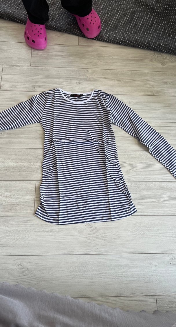 Pamuklu kumaştan, çizgili ve uzun kollu, tekne yaka hamile tişörtü. Normal midi boyda, yanlarda hafif büzgülü, rahat ve şık bir günlük parça. Sıfır ürün.