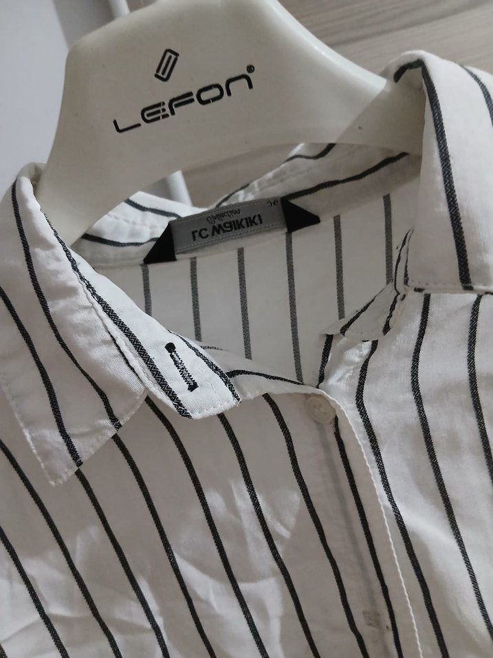 Bu beyaz gömlek siyah dikey çizgiler, yakalı ve kısa kollu tasarıma sahiptir. Pamuklu, düğmeli ve rahat kesimdir, günlük kullanıma uygundur. Markası 'LC Waikiki'.