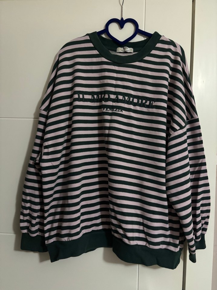 Kadınlar için uzun kollu, yuvarlak yakalı, pamuklu ve triko dokulu çizgili sweatshirt. Rahat ve bol kesim, günlük kullanıma uygun. Pembe ve Yeşildir