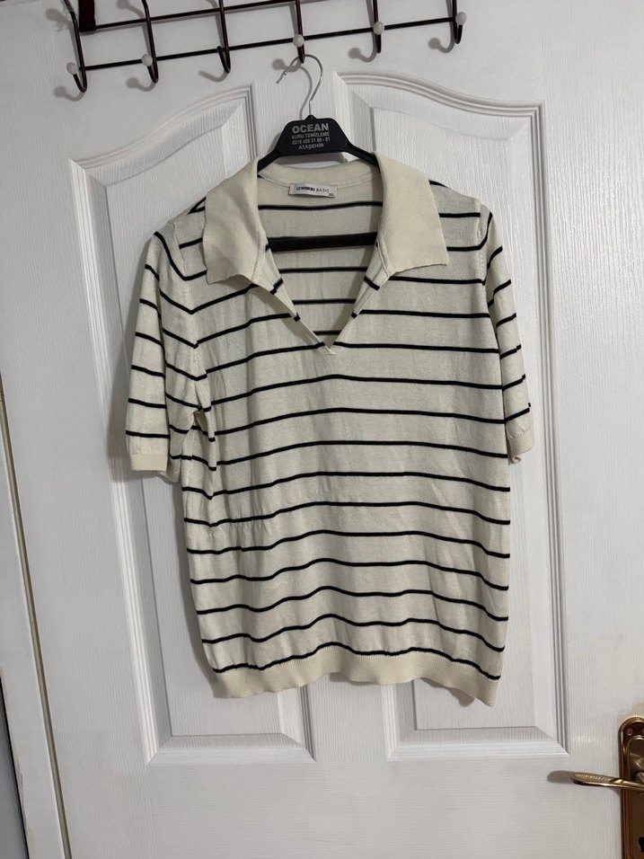Siyah Beyaz çizgili renkli, pamuklu kumaştan kısa kollu, yakalı ve çizgili desenli, rahat kesim kadın gömleği.  iğne ucu kadar bir leke var görselde belirttim çok yakından belli oluyor başka bir sorun yok likralı triko kumaş esnek rahat