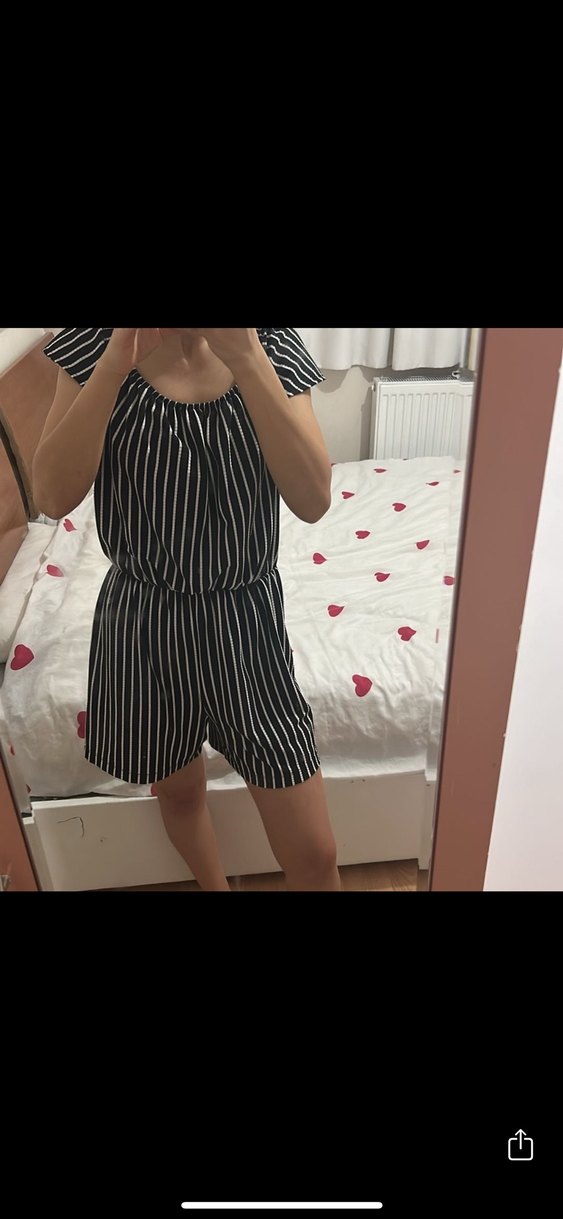 Pamuklu, bol kesim, pileli detaylı, askısız yaka ve çizgili desenli kısa tulum. Günlük sokak stili için uygun.