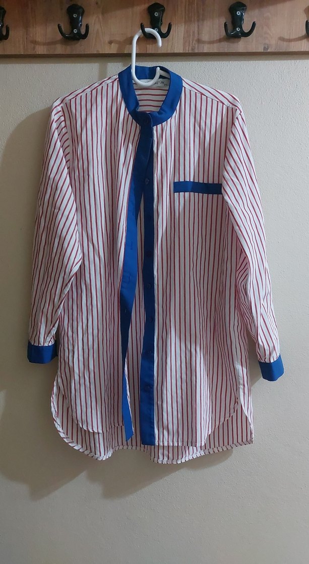 Renkli çizgili kadın gömlek, uzun kollu ve yakalıdır. Pamuklu kumaştan, düğmeli önü ve mavi detaylarıyla rahat bir kesime sahiptir. kadriye baştürk markasına ait