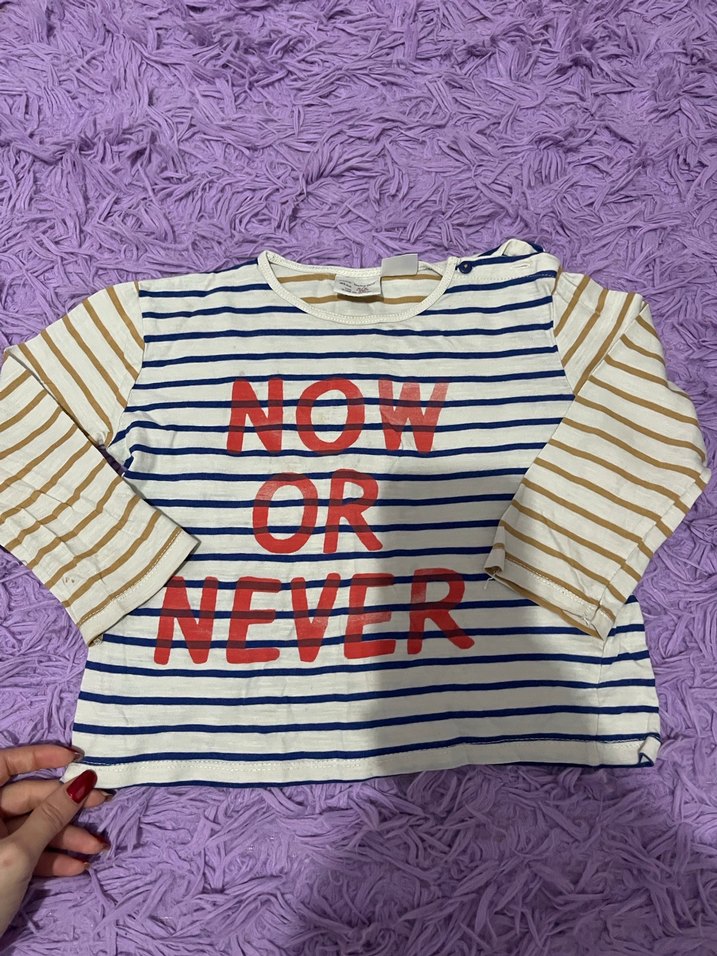 çocuk için pamuklu, örme kumaştan uzun kollu ve bol kesim tişört. Önünde "NOW OR NEVER" yazılı baskı ve çizgili deseni bulunur. Beyaz, mavi ve bej tonlarında çizgilerle rahat bir tarz sunar.