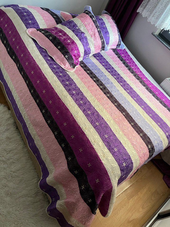 Pastel tonlarda çizgili çok renkli yatak örtüsü, yumuşak ve sıcak bir görünüm sunar. Uyumu sağlayan yastık kılıfları ile birlikte.