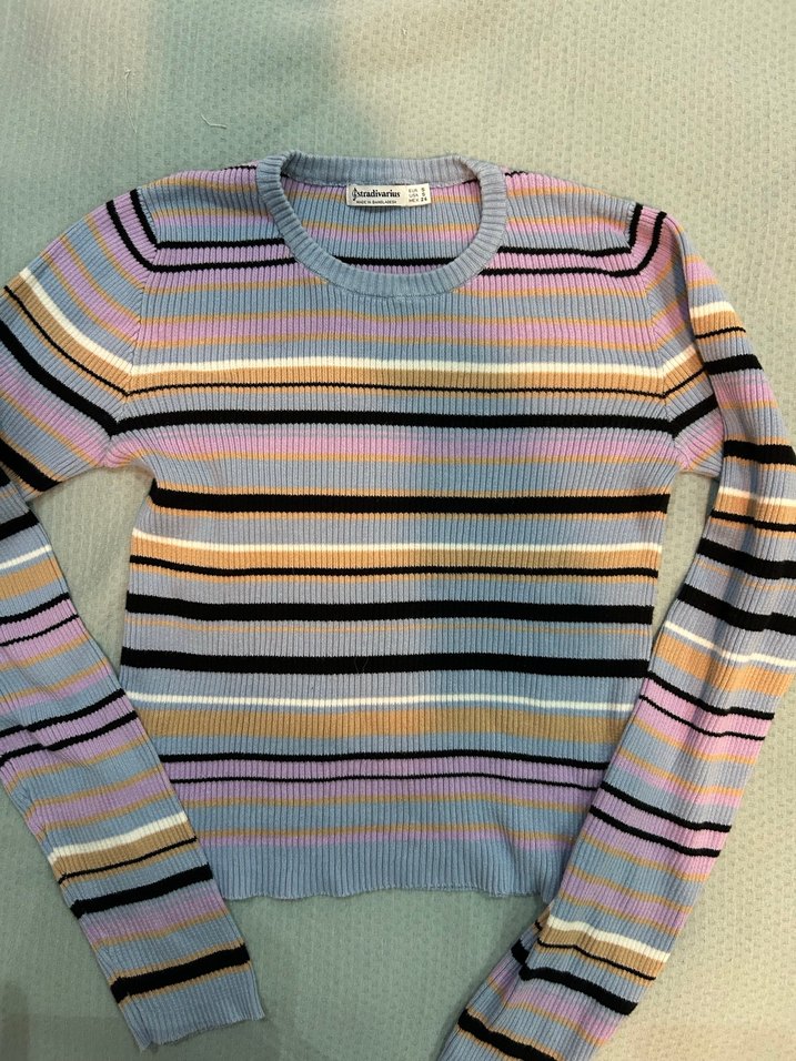 Uzun kollu, yuvarlak yaka, pastel çok renkli çizgili, yumuşak dokulu, dar kesim kadın kazak.