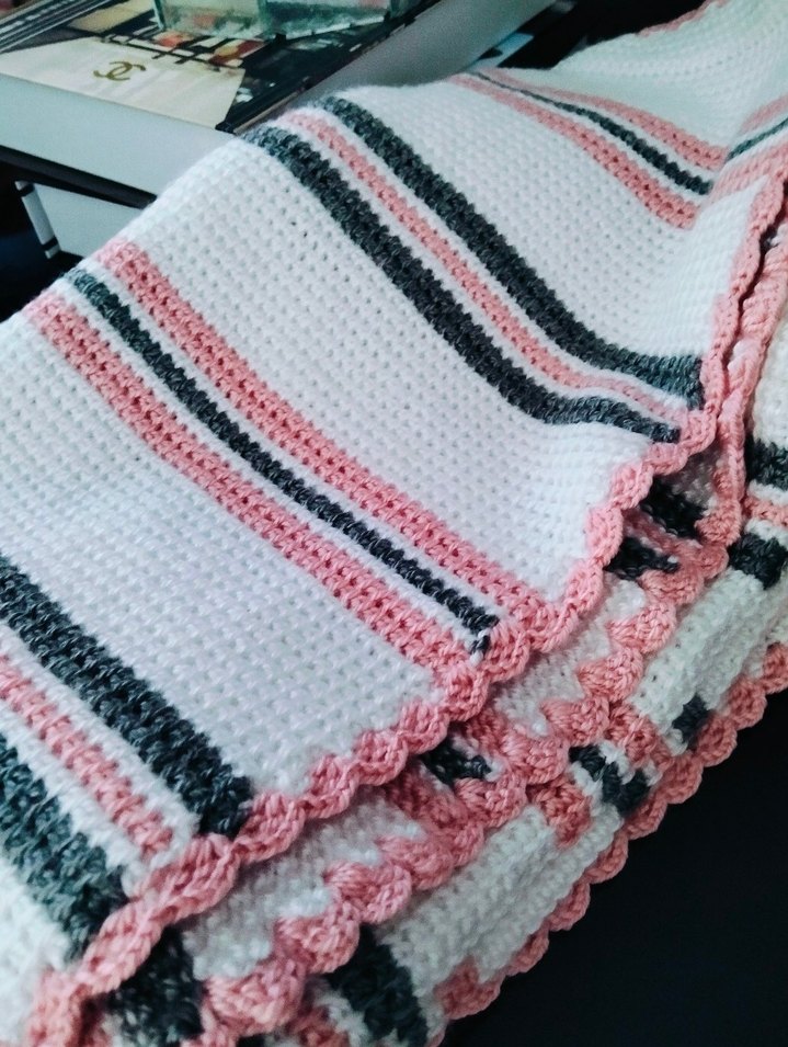 Pembe, gri ve beyaz çizgili örgü dokusu olan çocuk battaniyesi, yumuşak ve rahat bir his sunar. Kenarında fırfırlı detay bulunur. Hiç kullanılmadı.