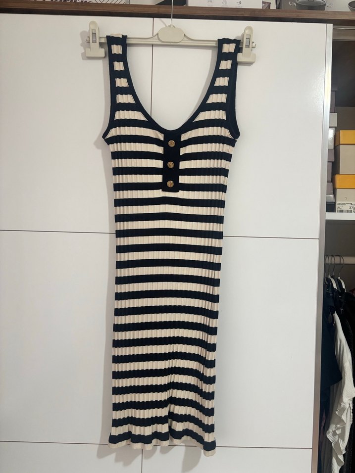 Kolsuz, v yaka, çizgili triko elbise, düğme detaylarıyla şık ve fit kesim. Günlük kullanım için uygun.