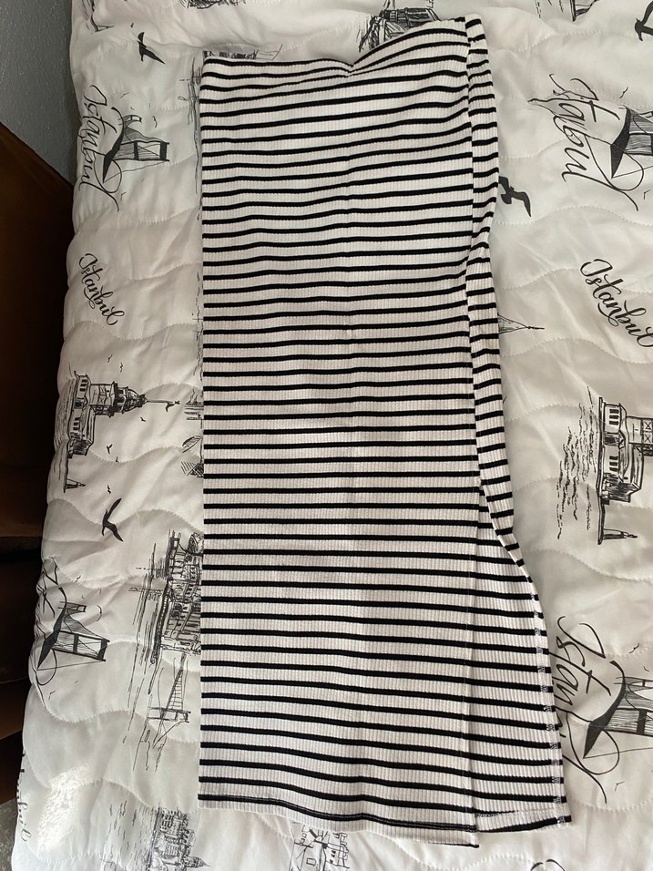 Gri ve beyaz çizgili, pile detaylı, vücuda oturan uzun kadın eteği. Yumuşak sentetik kumaştan üretilmiş, günlük rahat sokak stili için uygun.