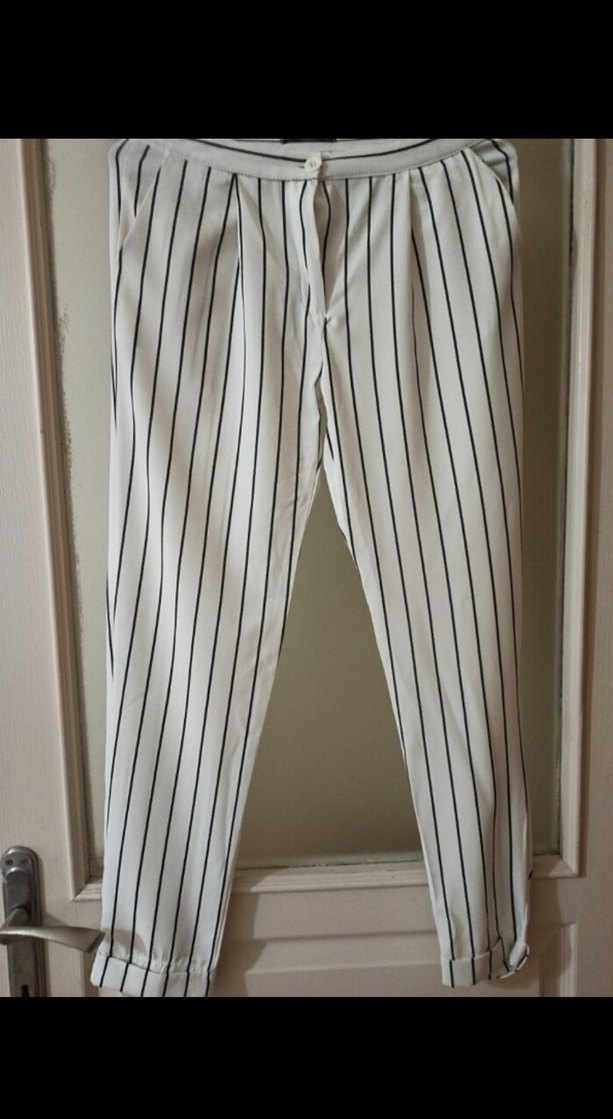 Gri dikey çizgili, pilili, midi boy, regular fit beyaz kadın kumaş pantolon, ofis için uygundur.
