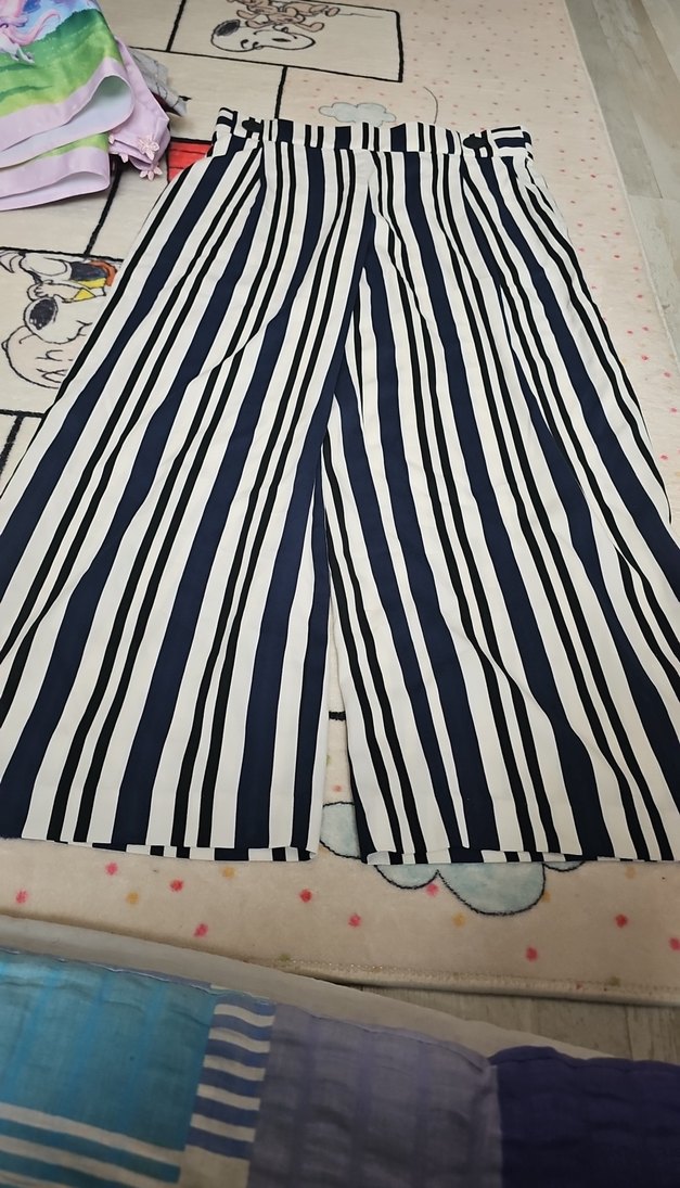 Kadınlar için bol kesim, pilili ve dikey çizgili uzun kumaş pantolon. Yumuşak sentetik kumaştan, günlük sokak stiline uygun.