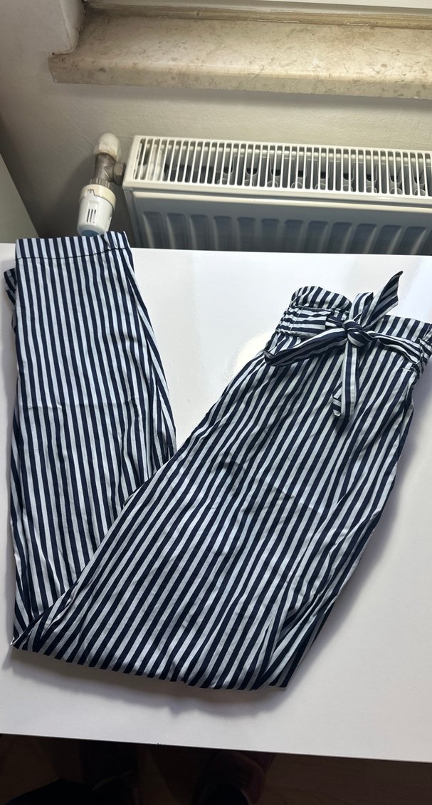 Uzun paçalı, pilili ve çizgili desenli kadın pantolonu. Mavi ve gri renklerde, sentetik kumaştan, günlük kullanıma uygun şık bir sokak stili parçası.