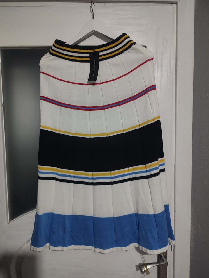 Kadın uzun eteği, sentetik kumaştan yapılmış, çizgili ve pilili tasarıma sahiptir. Gevşek kesimi ve hafif renkli çizgileriyle günlük sokak stiline uygundur.