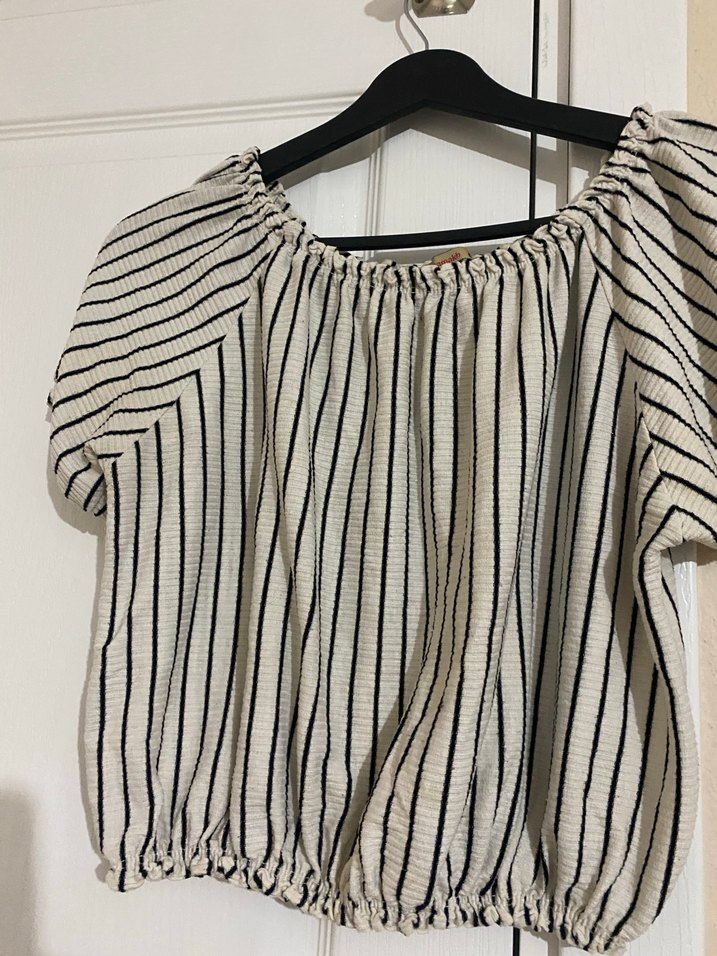 Kadınlar için keten kumaştan, çizgili ve pilili, kısa kollu, salaş kesim midi uzunlukta tekne yaka bluz. Lastikli