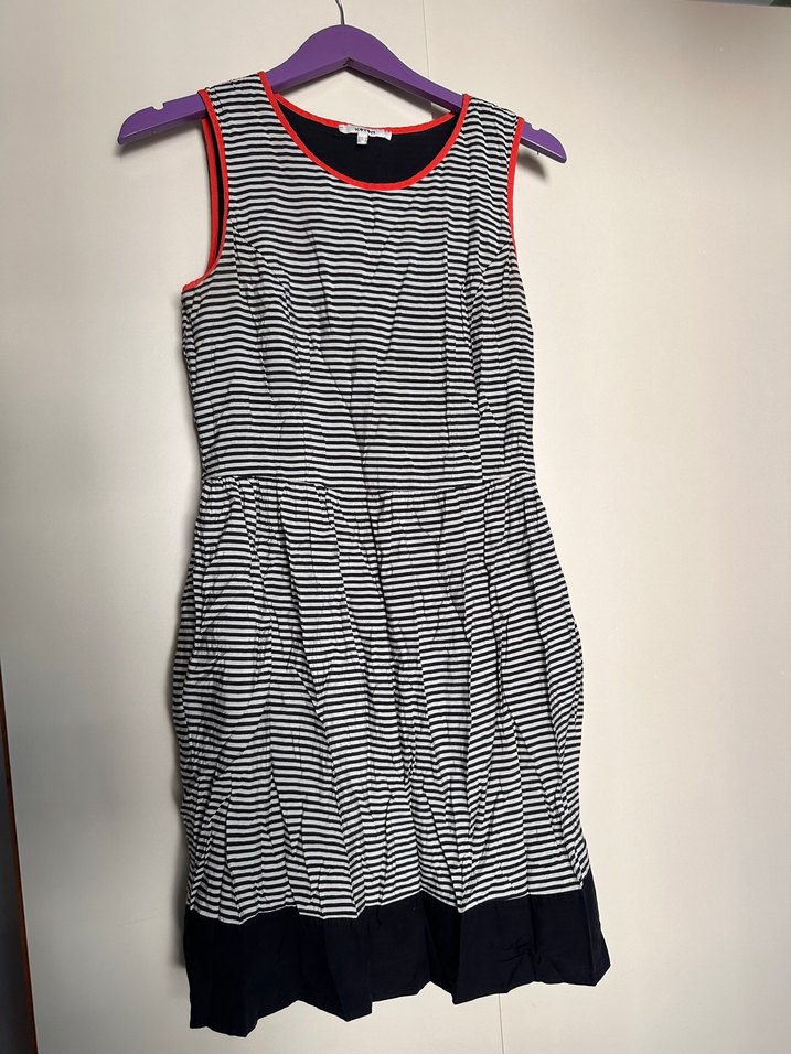 Kolsuz, pilili ve çizgili desenli midi elbise. Dar kesim ve yuvarlak yakaya sahip, canlı renk detaylarıyla sentetik kumaştan üretilmiştir. Günlük kullanıma uygundur.