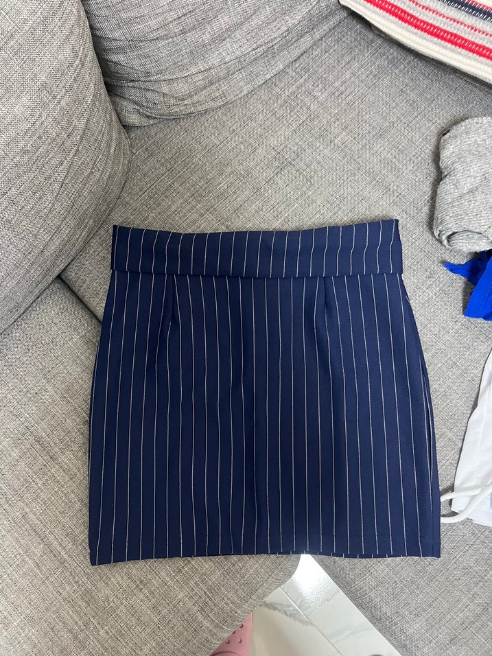 Çizgili Pilili Mavi Mini Etek