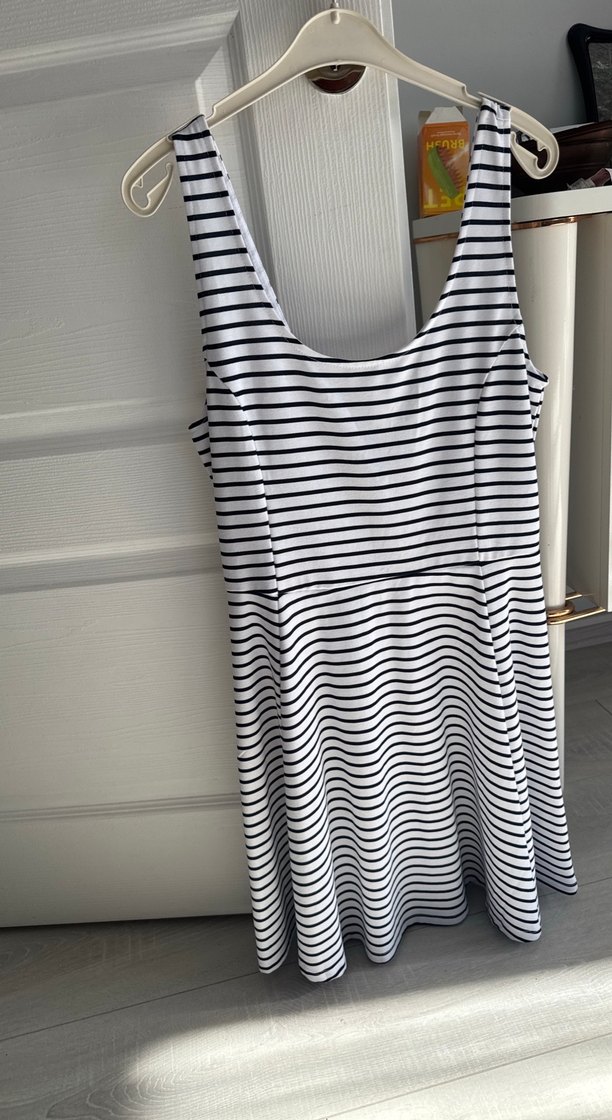 Kolsuz, midi boy, tekne yaka elbise. Beyaz ve gri çizgili, pilili detaylı, sentetik yumuşak kumaştan yapılmıştır. Casual kullanım için uygundur. Kolsuz elbise istemediğim için satıyorum.