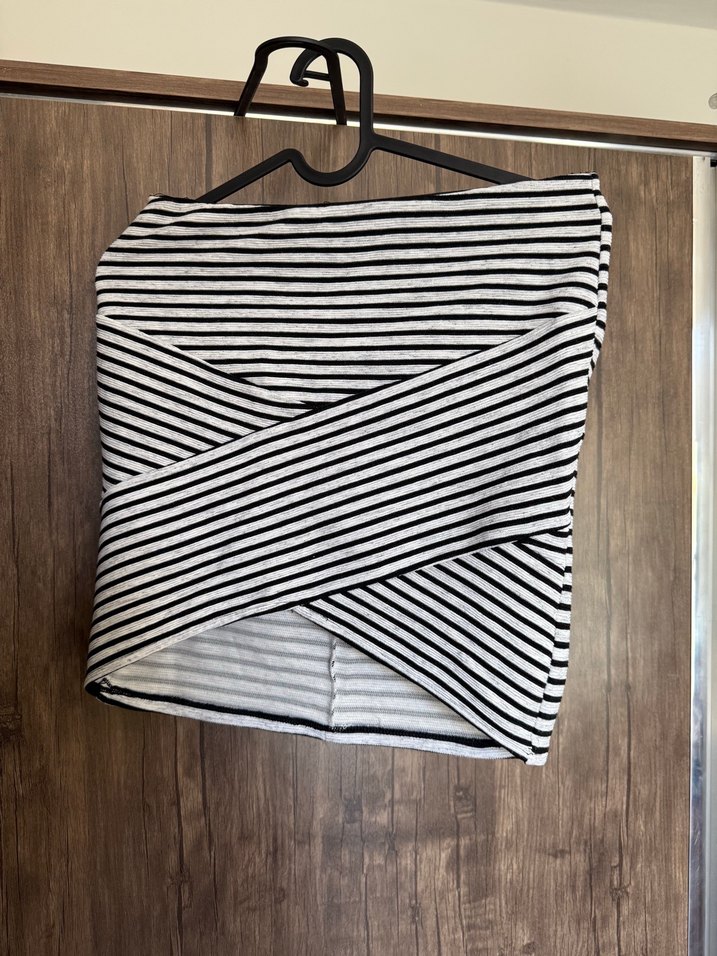 Pilili, çizgili ve dar kesim gri hamile eteği, midi boyda, yumuşak sentetik kumaştan üretilmiştir. Paris sokak modasına uygun, trend bir parça.